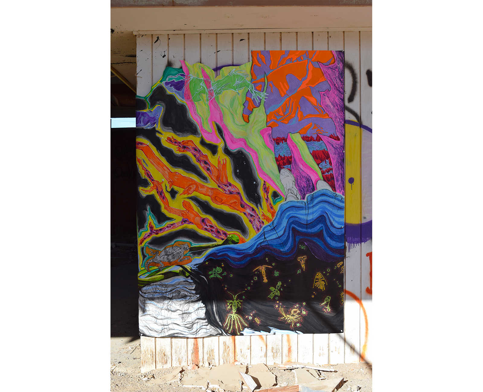 Site-specific installation of multi-media drawing. Drawing materials include: paint pen, crayon, watercolor, ink, collage, hand-marbled paper, colored pencils, markers, and pen on paper.