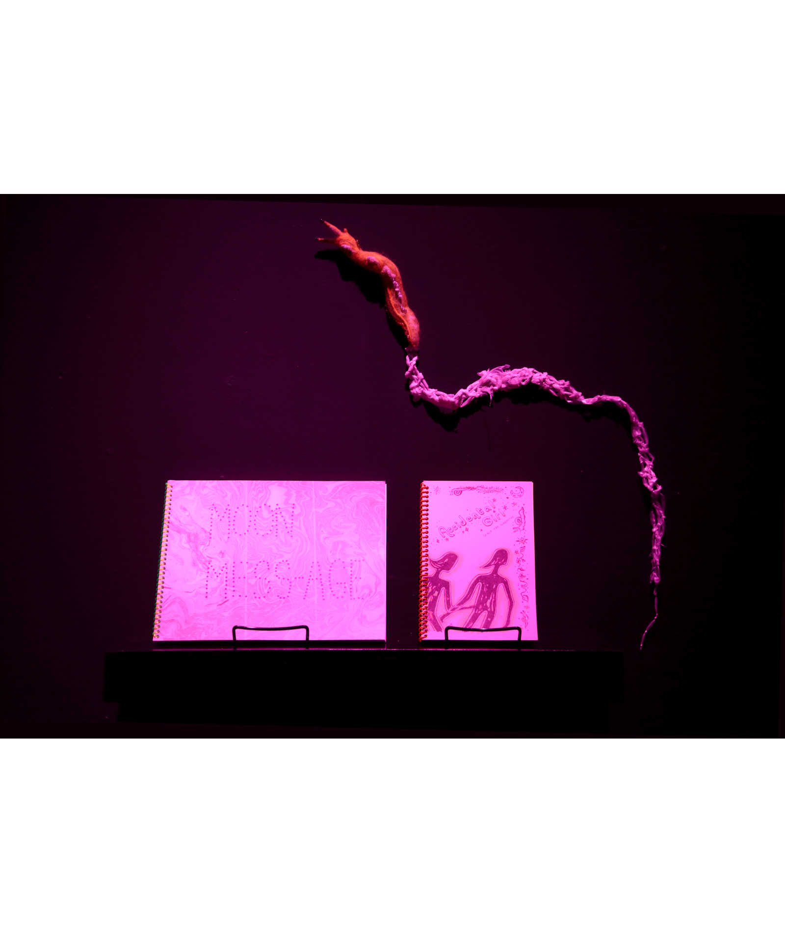 Works on paper, textile works, felted sculptures, self-published books, collaborative sound track made with John Dombroski and Lauren Jones.