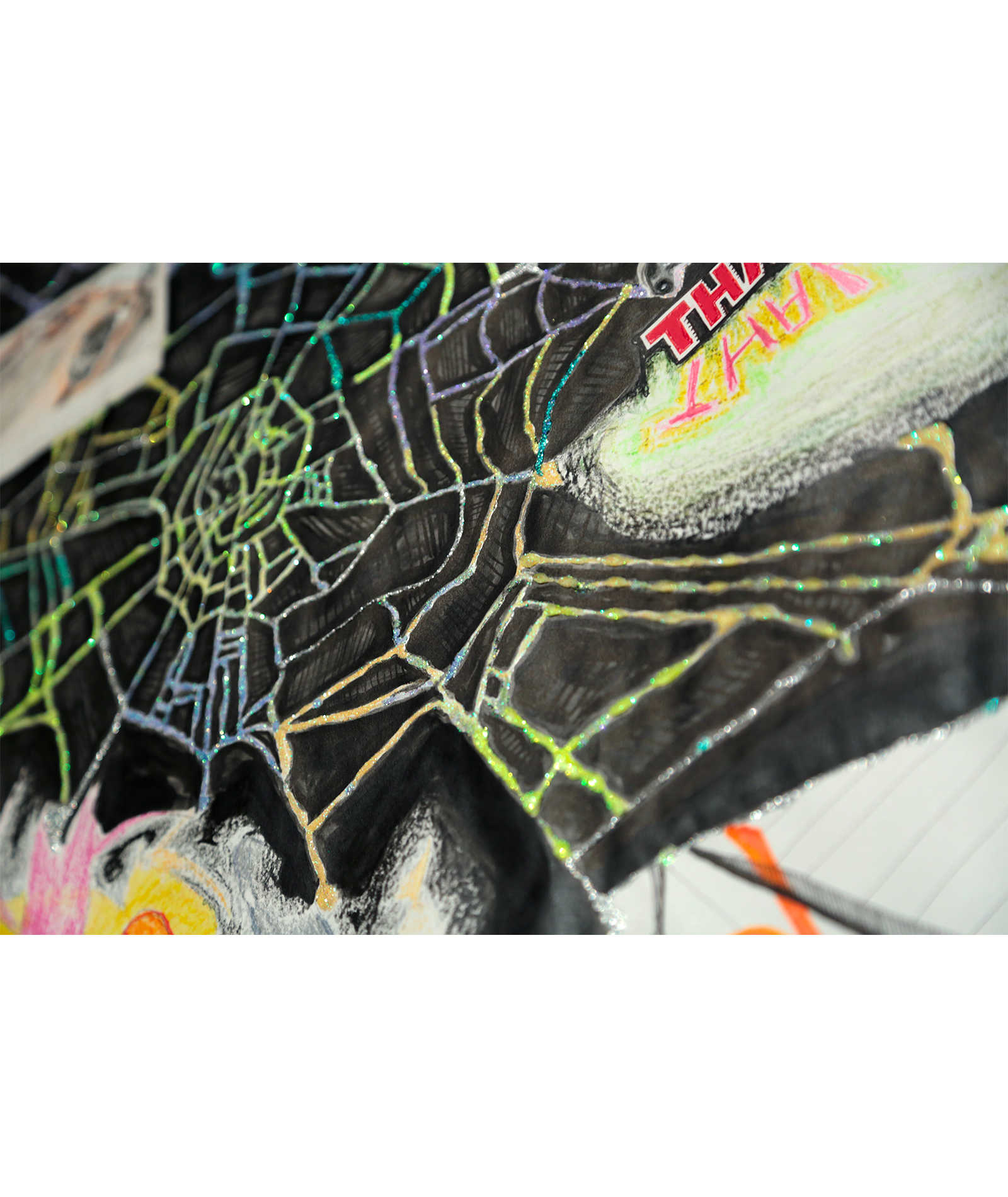 Works on paper, textile works, felted sculptures, self-published books, collaborative sound track made with John Dombroski and Lauren Jones.